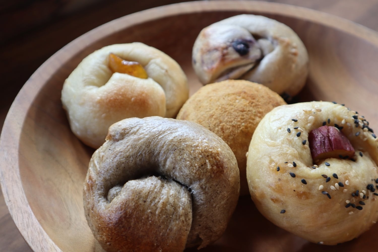 自家栽培の金柑のシロップ漬けを入れた生地に、北海道産クリームチーズを巻き込みました。季節限定ベーグルです。
